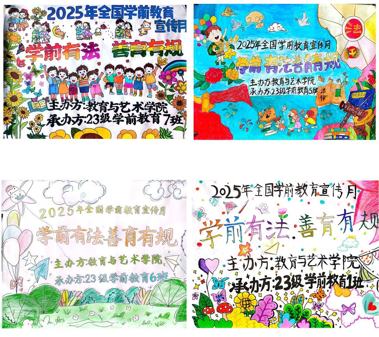 创意化视觉表达,传递法治强音。在海报创作环节,学生们以班级为单位,将所学的法律知识与创意设计相结合。他们精心构思、巧妙布局,运用丰富的色彩、生动的图案和简洁的文字,将《学前教育法》的宣传融入一幅幅精美的海报作品中。有的海报突出“儿童优先”原则,用可爱的卡通形象展现对幼儿权益的保护;有的聚焦教师职业规范,以图文并茂的形式强调依法执教的重要性;还有的围绕家园共育,呼吁家庭与幼儿园携手,共同为幼儿创造良好的成长环境。每一幅海报都凝聚着学生们的智慧与心血,彰显着他们对学前教育事业的热爱与使命感。