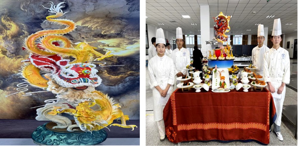 作为实训指导教师,权伟伟老师在坚守"捏、搓、揉、塑"传统技法的基础上,创新性地将现代雕塑造型理论与食品工艺相结合,他研发的可食用色素配方既保留传统面色温润质感,又符合食品安全标准;在题材上突破传统花鸟人物局限,创作的《鹿鸣春晓》《锦鲤戏莲》等作品以胡杨精神、驼队剪影再现古丝绸之路繁华,将地域文化符号转化为了立体艺术语言,作品《敦煌飞天》融合敦煌壁画112窟艺术基因,在2025年甘肃省职业院校技能大赛中斩获二等奖。