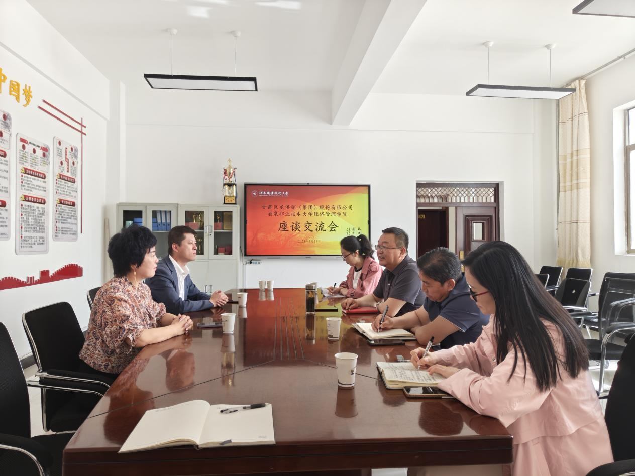 为深化产教融合、推动校企协同育人,5月14日,甘肃省巨龙供销(集团)股份有限公司与经济管理学院校企合作座谈会在经世楼一楼会议室顺利举行。甘肃酒泉汉武酒业集团有限公司总裁杨海丽、董事会秘书吴斌,经济管理学院党支部书记丁天明、院长张晓彬等出席座谈交流会。