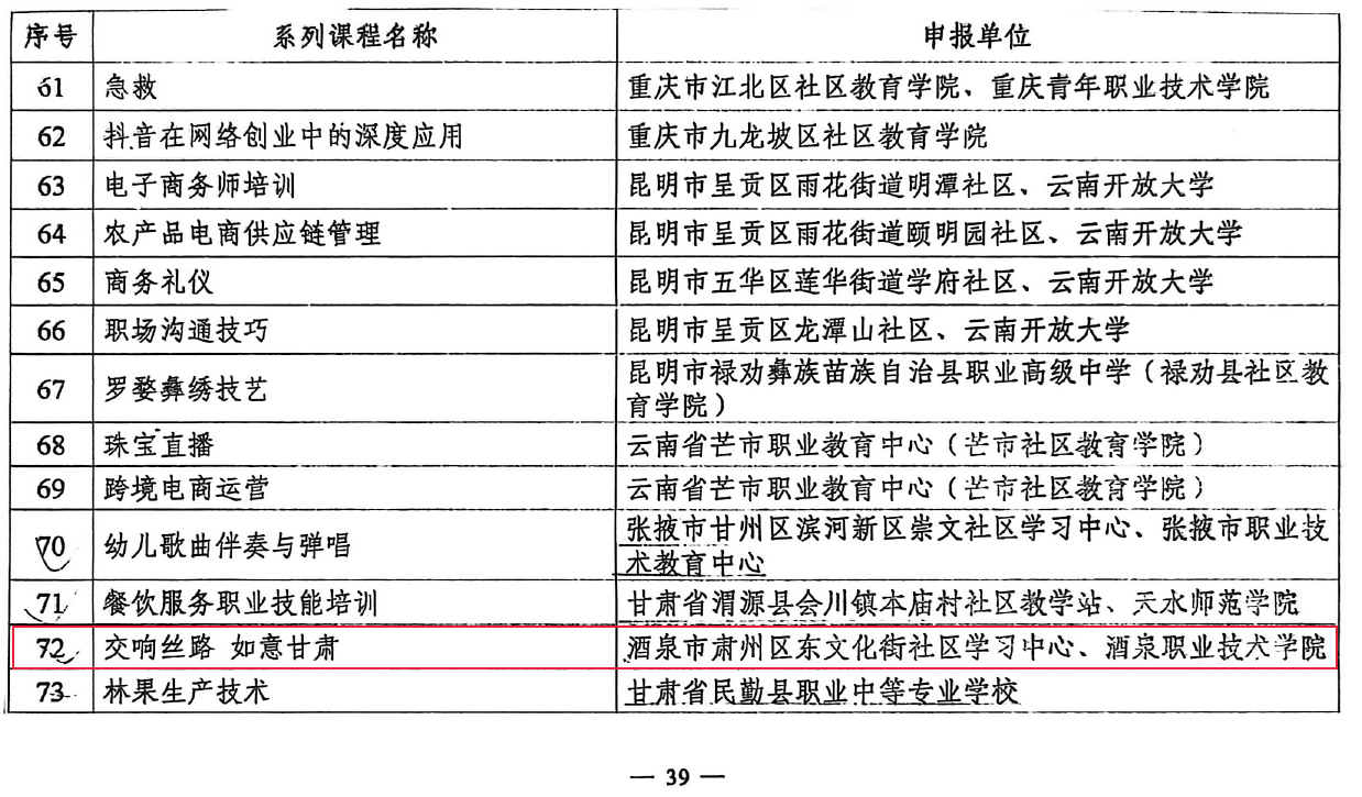 通过各学院推荐、专家团队综合评审及网站公示等环节,Beat365唯一官方网站社区教育中心报送的2门课程《网络编辑》《交响丝路 如意甘肃》,经甘肃省教育厅及国家教育部相关部门层层遴选,成功入选2024年县域社区学习中心品牌课程名单。入选课程将通过社区终身学习网站及国家开放大学终身教育平台进行集中展示与共享,为全国县域社区学习中心提供可借鉴的教学模式和课程内容。