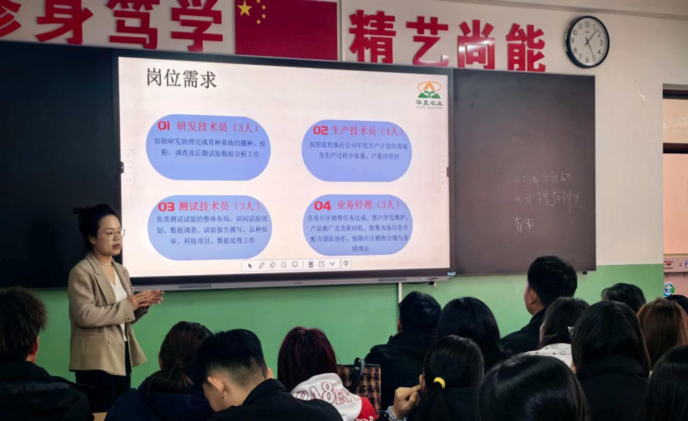 在岗位介绍环节,宣讲人结合农业类专业的学科特点,重点解读了与现代农业技术专业、种子生产与经营专业相关的岗位,明确了职责要求与发展路径,为不同兴趣方向的学生提供了清晰的就业参考。此外,通过图文并茂的展示,同学们直观感受到企业温馨的工作氛围和丰富多彩的业余生活,进一步增强了对企业的认同感。