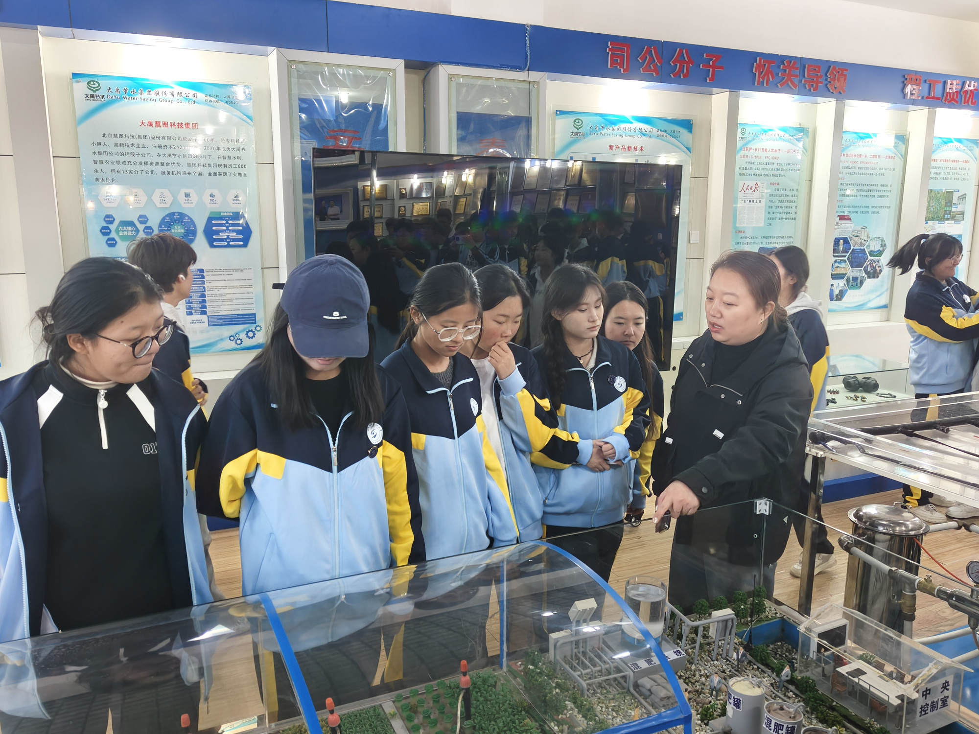 在大禹节水集团,师生们依次参观了国家级重点实验室、滴灌产品智慧生产车间与企业水文化展馆。国家级实验室内,技术人员现场演示了节水灌溉技术的核心研发流程、新材料性能测试及智慧水利云平台的模拟调控,使同学们对“数字孪生”“智能感知”等前沿技术在水利领域的应用有了具象化理解。走进滴灌生产车间,全自动化的滴头、滴灌带生产线有序运转,从原料改性到精密注塑,从在线检测到智能包装,完整展现了高效节水器材的规模化、标准化制造过程,令学生们深切体会到“精益制造”与“质量闭环”在保障国家水利装备产业链中的关键作用。