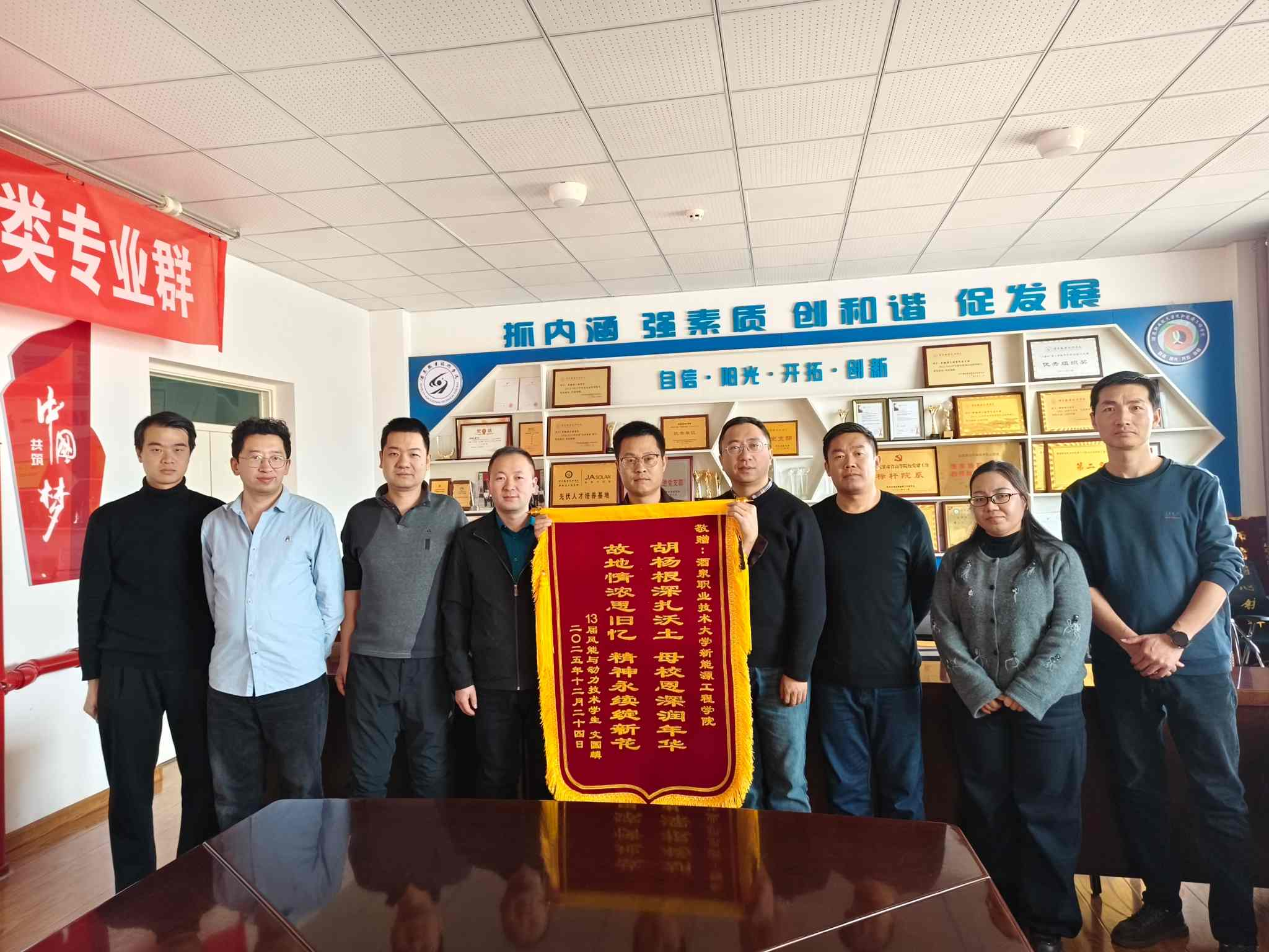 2025年12月24日,文国麟为表达对母校的培养,专程送来了锦旗。新能源工程学院组织风能与电力工程系的老师与昔日的弟子亲切交谈。他愉快地回顾了当年求学时的美好时光,诚挚地感谢了母校的恩情,又针对专业建设、行业发展、人才需求等方面与老师们展开了深入交流。
