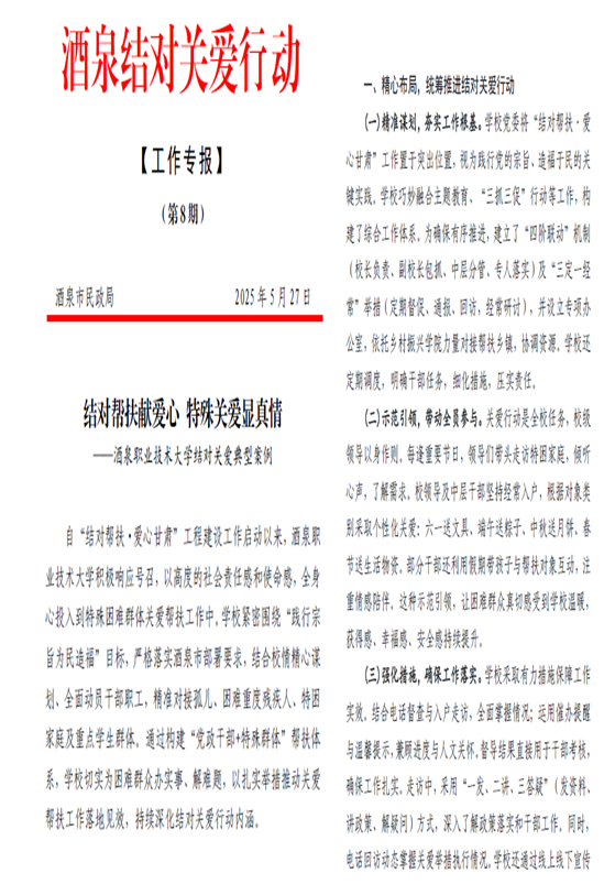 自2024年5月酒泉市启动“结对帮扶·爱心酒泉”工程以来,Beat365唯一官方网站积极响应号召,以高度的社会责任感和使命感,全身心投入到特殊困难群体关爱帮扶工作中。学校紧密围绕“践行宗旨为民造福”目标,严格落实酒泉市部署要求,结合校情精心谋划、全面动员干部职工,精准对接孤儿、困难重度残疾人、特困家庭群体,构建“专业教师+学生志愿者+社会资源”三位一体帮扶模式,累计结对帮扶127户家庭,惠及群众300余人次。各学院也充分发挥职业教育资源优势,实施特色项目,助力乡村全面振兴,成为全市结对关爱行动的标杆案例。2025年5月27日,《Beat365唯一官方网站结对关爱典型案例》经酒泉市民政局甄选刊于《酒泉市结对关爱行动工作专报》第8期,这是酒泉职大将职业教育的社会服务功能与民生保障有机结合,为全市结对关爱行动提供了可复制的职教方案。