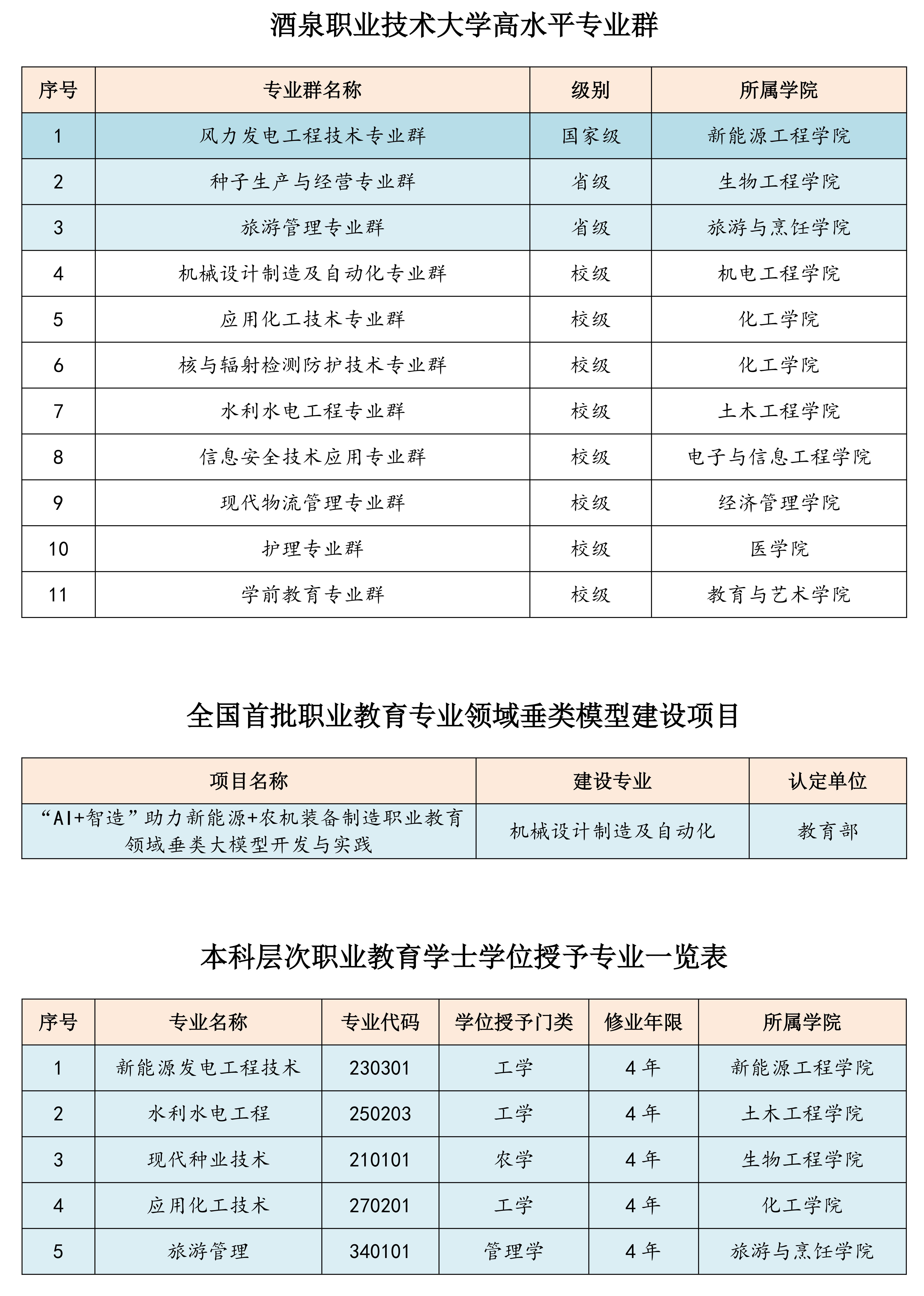 学校围绕区域主导产业不断优化专业群布局,推动教育链与产业链“双向奔赴”。风力发电工程技术专业群成功入选国家第二轮“双高建设计划”项目,种子生产与经营专业群入选甘肃省“双高建设计划”项目,学校跻身中国技能型高校国家队序列。同步优化完善应用化工技术专业群等8个校级专业群建设,一体化构建“国家级引领、省级支撑、校级夯实”的三级专业群发展体系。机械制造及自动化专业获批全国首批职业教育专业领域垂类模型建设项目,“AI+职业教育”教学改革取得关键突破。学校成功获批本科层次职业教育学士学位授予单位,新能源发电工程技术等首批5个职业本科专业同步获得学士学位授予资格,标志着学校人才培养层次实现历史性跨越。