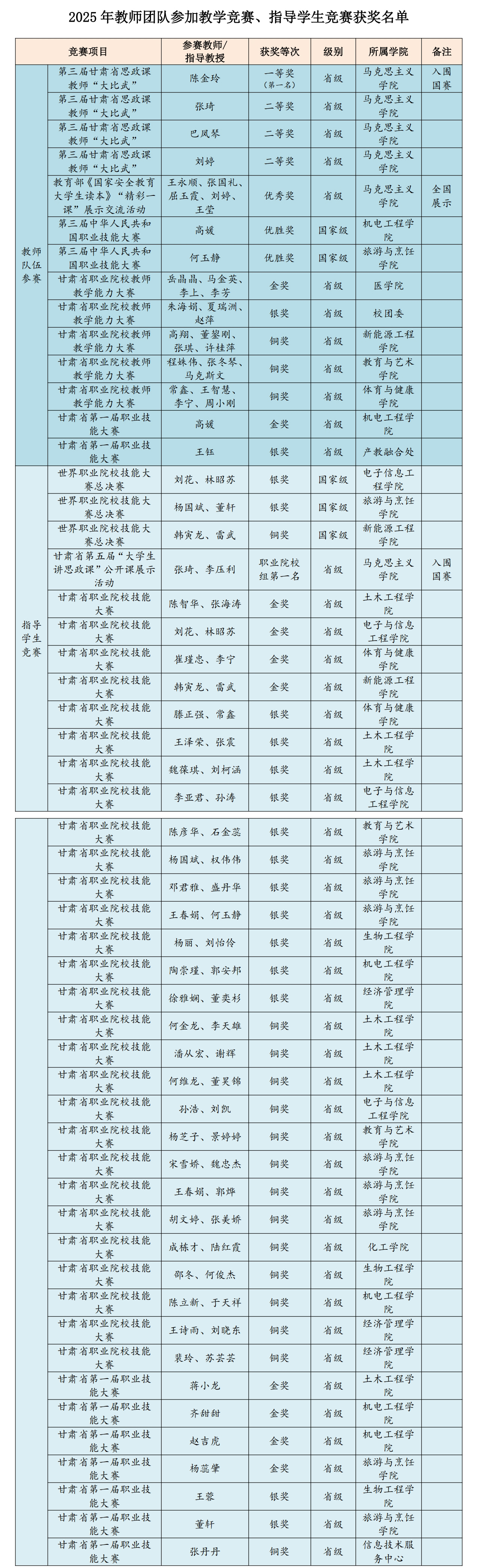 学校坚持“以赛促教、以赛促学”,着力锻造高素质“双师型”教师队伍。在第三届甘肃省思政课教师“大比武”中荣获一等奖1项、二等奖3项,获国赛资格;指导学生团队在甘肃省第五届“大学生讲思政课”公开课展示活动中荣获职业院校组第一名入围国赛。马克思主义学院建设的《国家安全教育》教学资源入选教育部“精彩一课”并在全国展示;思想政治教育工作成果获评2025年甘肃省学校优秀典型案例。专业教师高媛、何玉静荣获第三届中华人民共和国职业技能大赛优胜奖2项;5个教师团队荣获甘肃省职业院校教师教学能力大赛金奖1项、银奖1项、铜奖3项;专业教师高媛和王钰分别荣获甘肃省第一届职业技能大赛金奖和银奖。学生技能竞赛成绩突出,荣获世界职业院校技能大赛总决赛银奖2项、铜奖1项,获甘肃省职业院校技能大赛金奖4项、银奖11项、铜奖13项,获甘肃省第一届职业技能大赛金奖4项、银奖2项、铜奖1项。